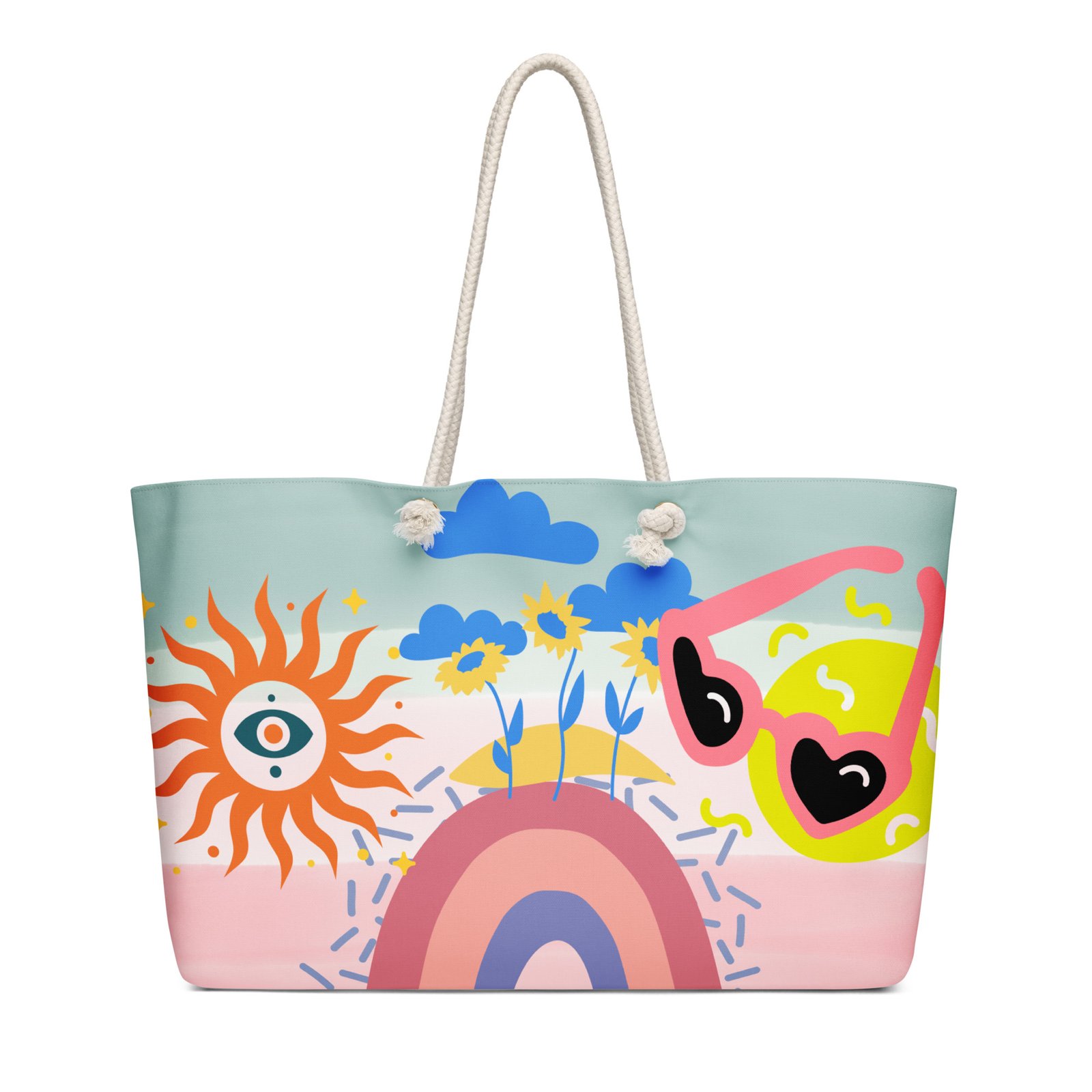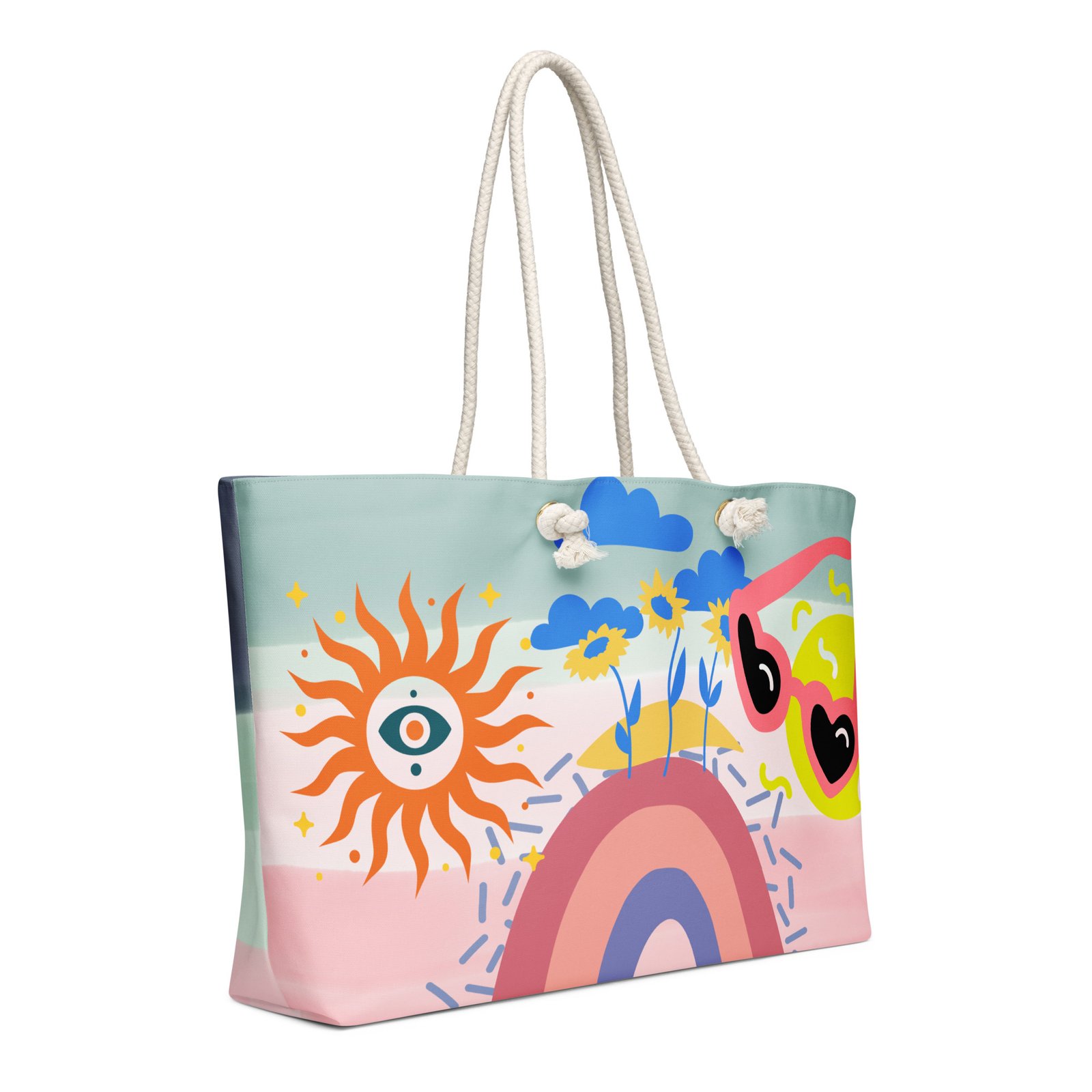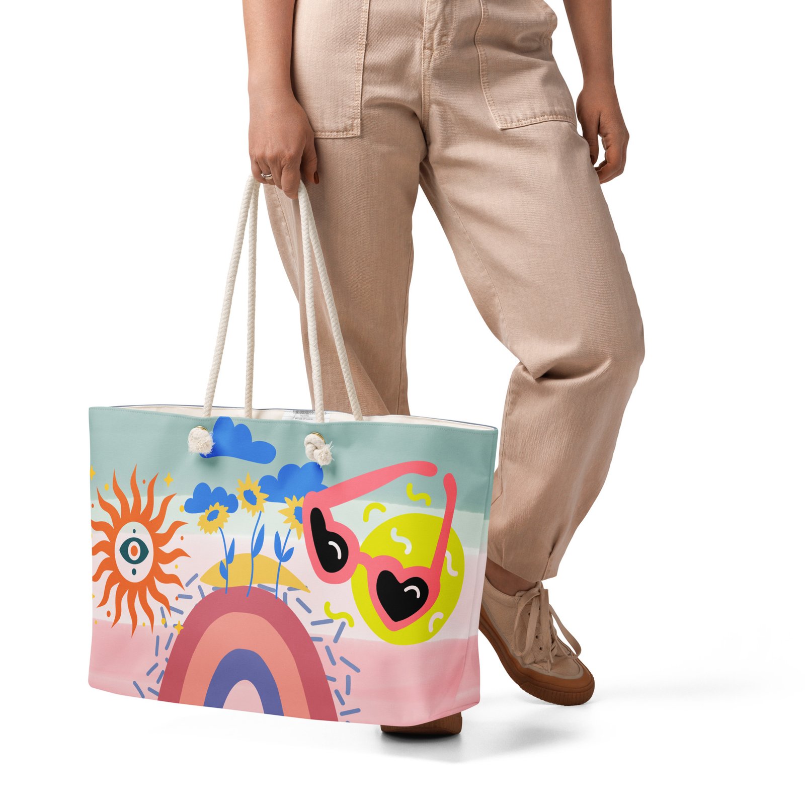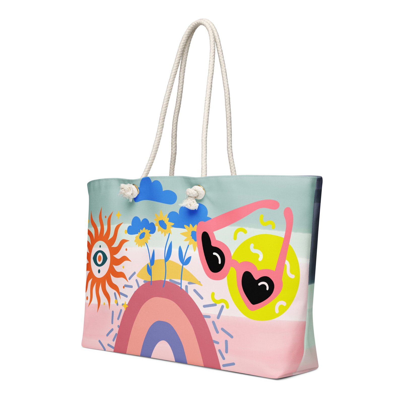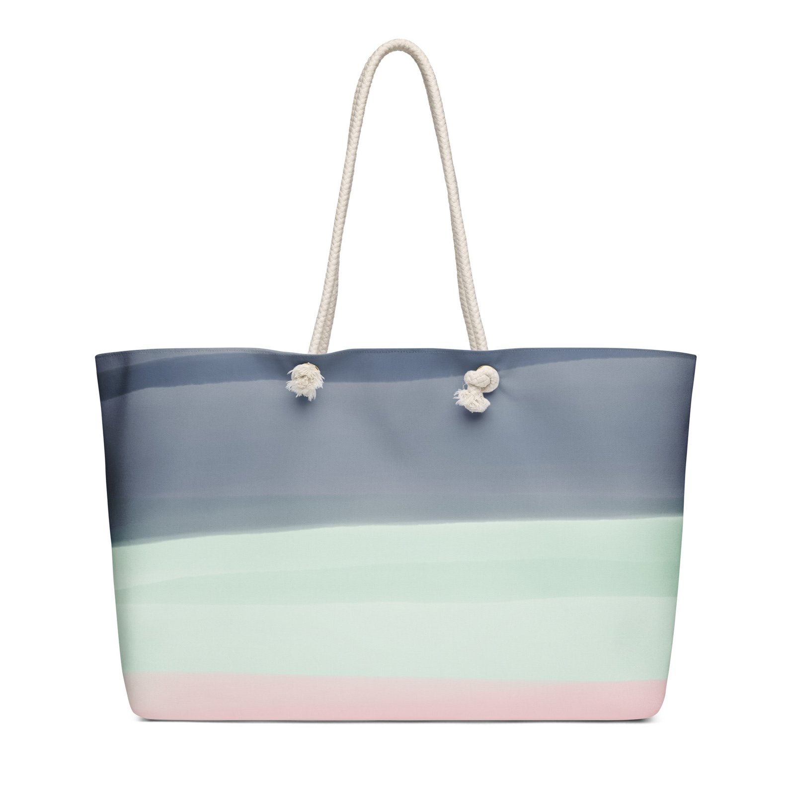 • Cream-colored cotton rope handles through metal grommets